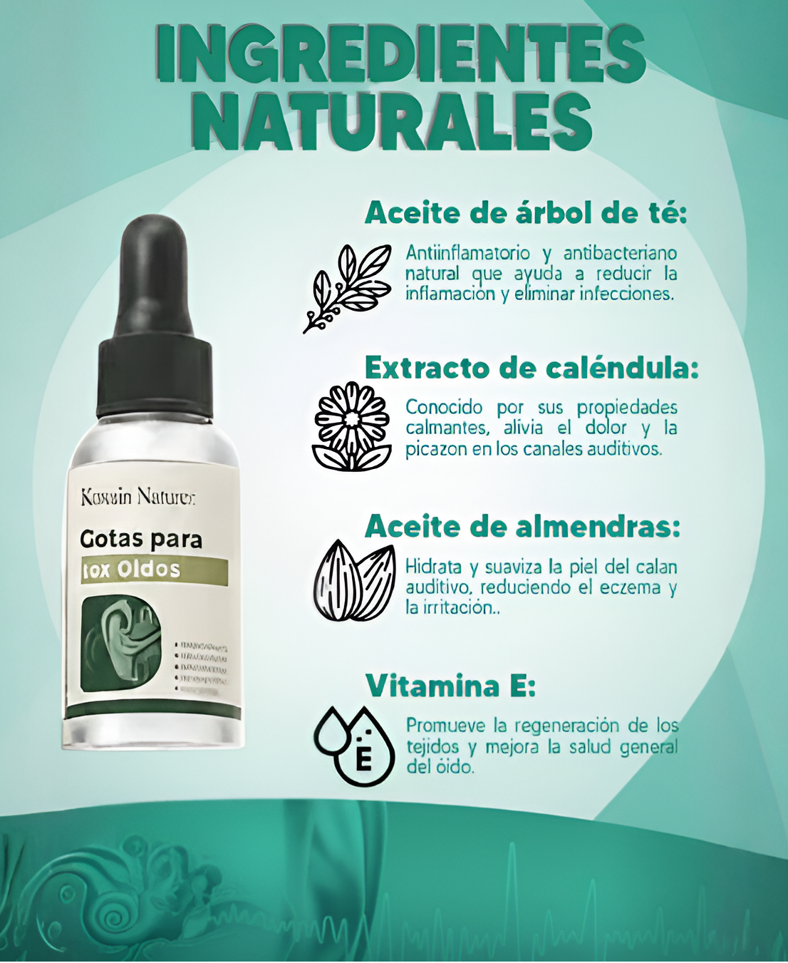Alivia el dolor, dile adios a los zumbidos y pitidos, con sus ingredientes naturales ayuda a la restauracion del canal auditivo y se encarga de hasta su limpieza.